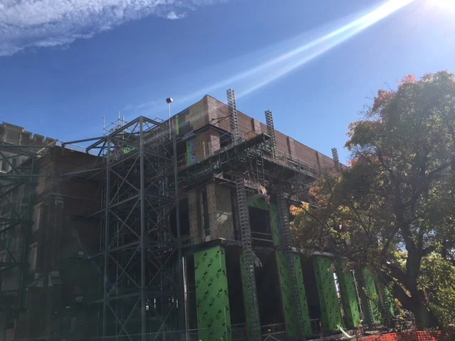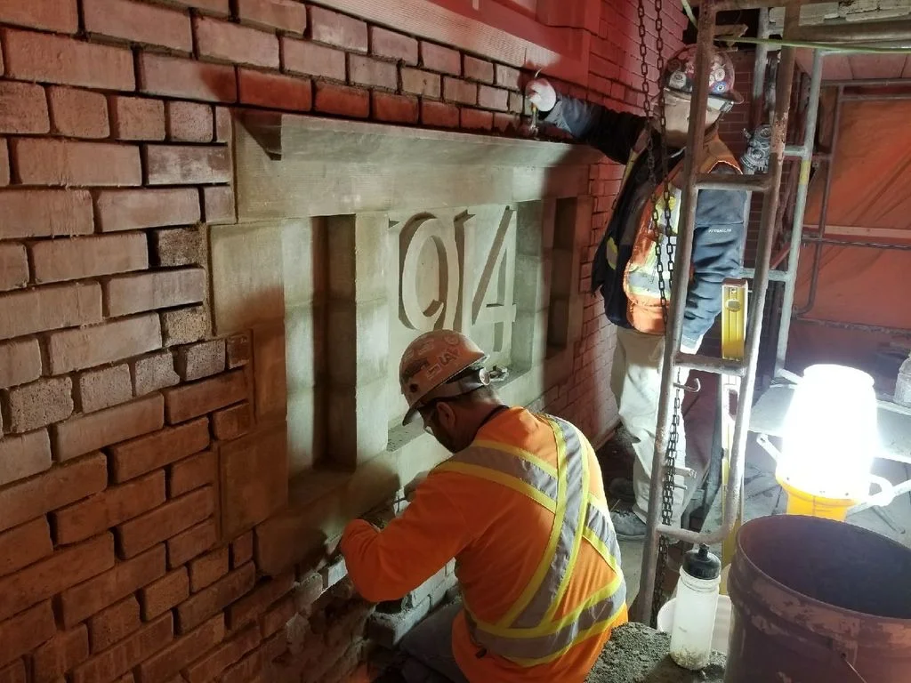 The entire building was repointed. Our team carefully removed the mortar in the brick and limestone joints. On top of this, our team removed countless feet of old failed sealant on the joints of most of the limestone. Our team accessed the work areas using conventional scaffold and Arial Work Platforms(AWP), however, a majority of the work was done using the Brxton fleet of Hydro Mobile Mast Climbing Work Platforms.