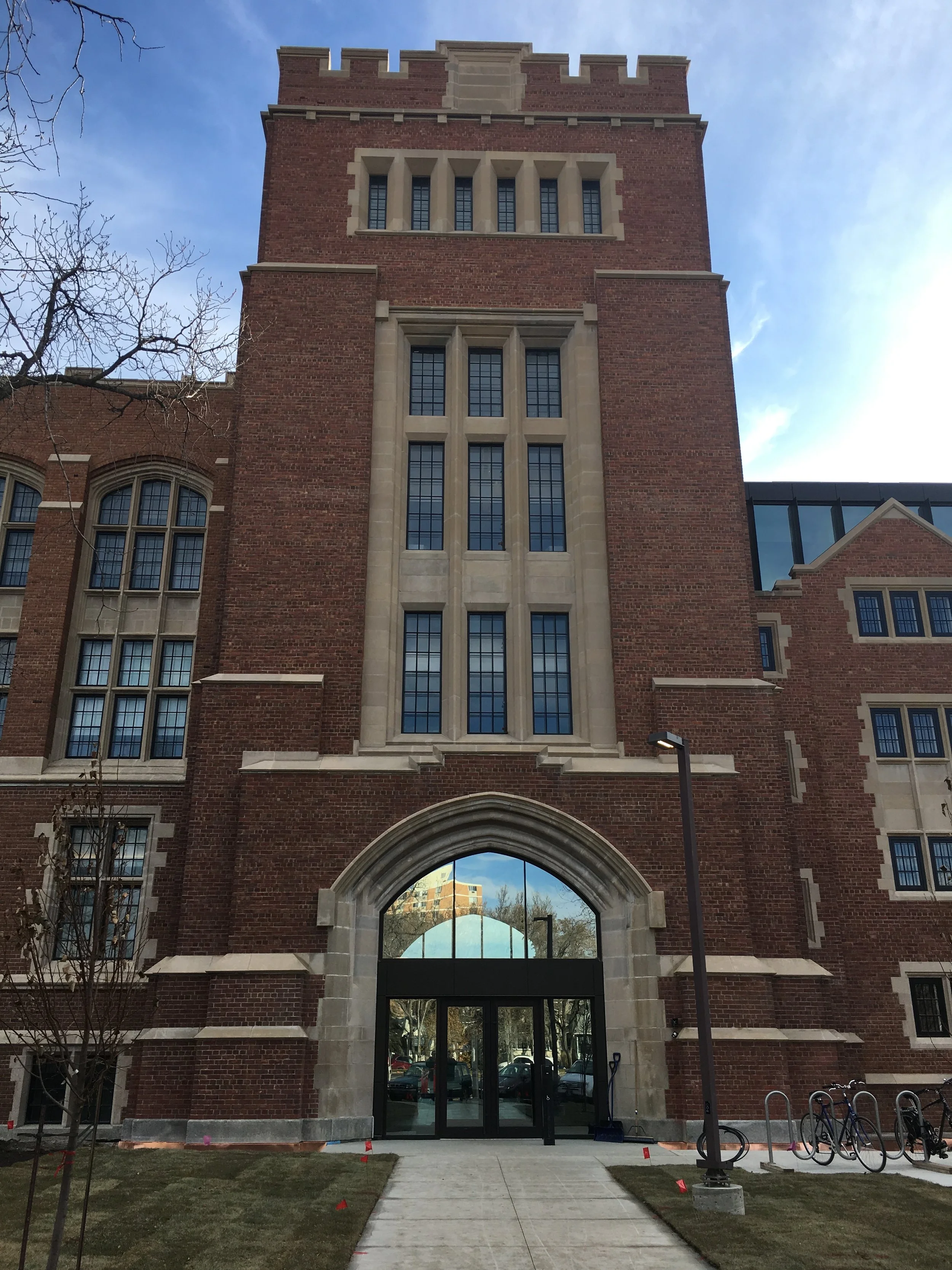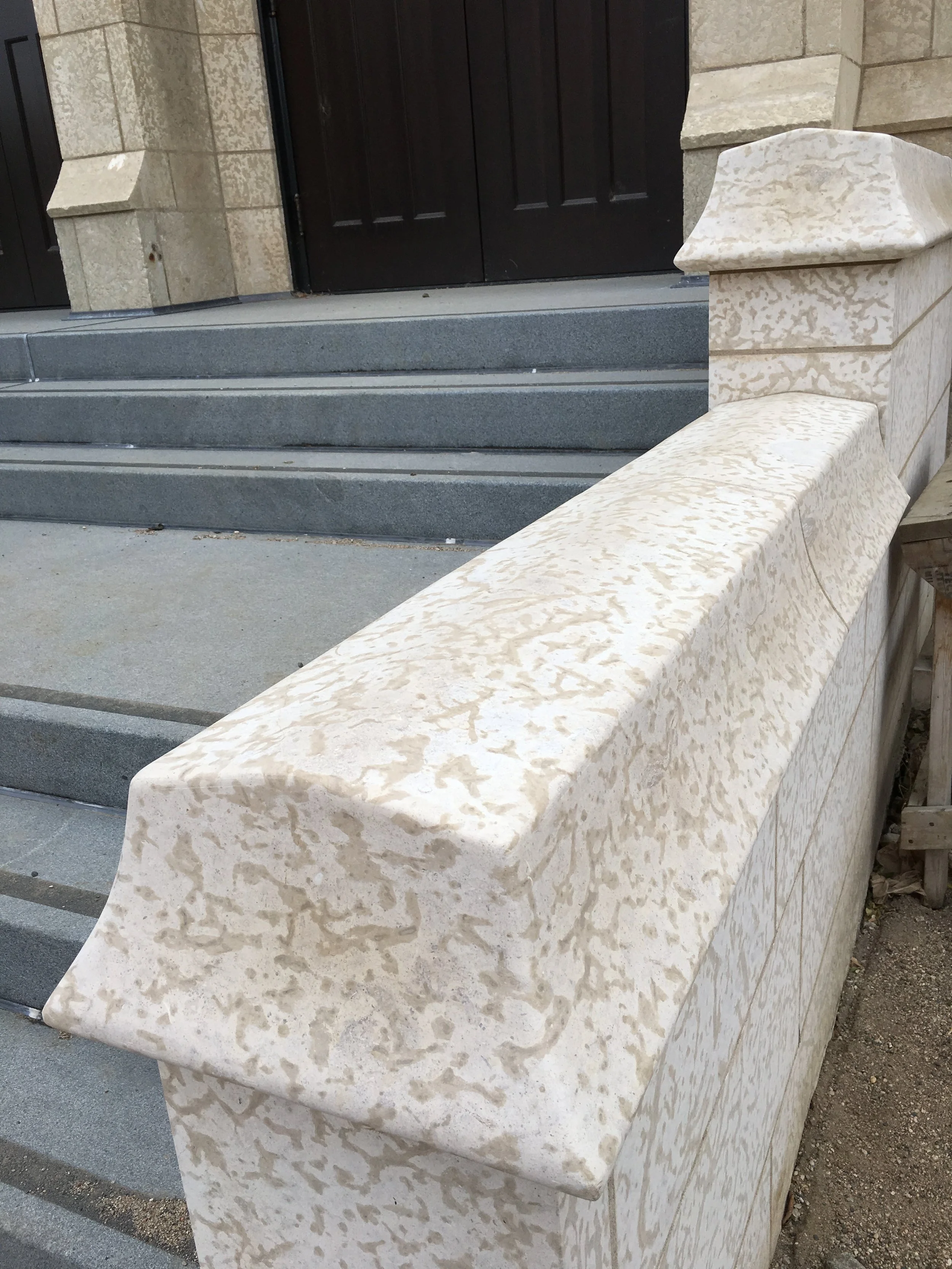 Brxton began Working on Darke Hall in the Fall of 2016. We started with a face lift on the north elevation of the building. This included removing the original mortar, full DOFF clean of the Tyndall Stone at the arches, copings, bands and cap stones. After the building was cleaned we installed new Hydraulic Lime Mortar to match the existing. This mortar has auto-genus(self healing) properties and was kept protected for a full 28 day cure. Once the mortar was dealt with, we began the process of replacing the existing stairs with new granite and hand carved Tyndall stone side wall copings(by Brxton expert craftsmen). After many months of masonry restoration, in conjunction with the work performed on the doors, roof, and windows, the results speak for themselves.